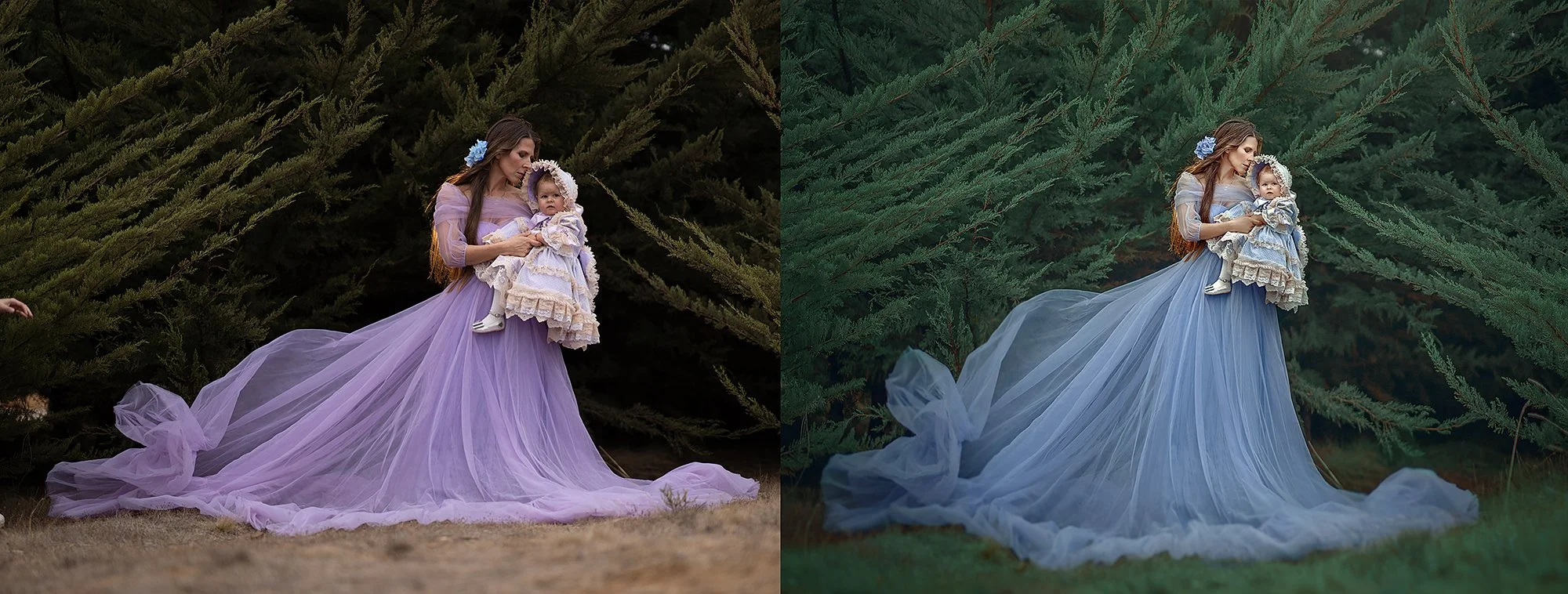 8 clases donde enseño cómo editar fotos de madre con hija: 1 foto de estudio con luz continua y otra en exteriores con luz natural.